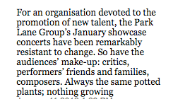 by Ivan Hewett in The Telegraph The Park Lane Group’s week-long New Year Series ought to be an occasion for rejoicing. What could be more heart-warming than a showcase for new performing talent, which highlights new music rather hoary old classics? But any flutterings of anticipation give way to gloom the minute one steps inside the concrete coffin of the Purcell Room, and struggles to make sense of the arcane programme-book. - - What disappears in all this musical horse-trading is any notion that a concert is more than a showcase. It should be crafted with love and imagination, as a way of giving pleasure - - and Anne Pickard in The Independent For young composers and musicians, the Park Lane Group's annual showcase is required listening. Here is the carrot and the stick: a scheme that sponsors recitals by emerging artists and ensembles with the proviso that 20th- and 21st-century music is central- - resurrecting PLG-approved works that would otherwise be heard only in the conservatoires. As an eco-system, PLG is perfect: self-supporting, renewable. But it seems to me that composers benefit more than the performers - - etc Peter Grahame Woolf