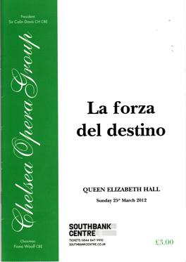 Giuseppe Verdi: La forza del destino Gweneth-Ann Jeffers Leonora Chelsea Opera Group Orchestra/Chorus/Robin Newton Queen Elizabeth Hall, London 25 March 2012 An exciting concert performance by Chelsea Opera Group of the earlier the 4 act original version, which has a shorter overture, an additional tenor aria, and a finale of 'bitter catastrophe rather than religious consolation'. The Queen Elizabeth Hall was packed with an audience of mainly 'seniors', the orchestra likewise (mainly non-professonal, so I I understand?) and the soloists were every single one them mature artists in fine voice (including two superb, powerful basses) - none overwhelmed by the large orchestra being not buried in a pit. COG's almost entirely amateur orchestra was fully worthy of the care put into this event by Robin Newton (who had been extensively associated with Opera Rara- see our review of the Opera Rara CDs of this version; now c.£40 from Amazon). Notable solos at QEH were to be admired from the leader, Diana Cummings, and the 1st clarinettist Alan Maries. This concert was being recorded with an array of microphones (for what destination was not stated) but I gather that Chelsea Opera Group records all its major concerts for private consumption; surely this one was good enough to be worth releasing commercially? The border line between best of the not wholly-professional opera companies and minor opera house productions which are often limited by production costs is getting ever narrower, with interesting repertoire ofte the decider. It must be hard for the international site TheOperaCritic, based in New Zealand, to know where to draw the line; regrettable, though understandable, that the first modern staged production of a late Rameau opera hasn't quite made it into their their columns. Peter Grahame Woolf