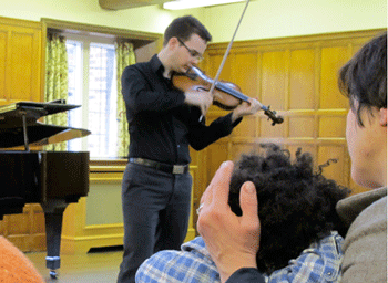 Grieg, Violin Sonata no. 3 Op.45 Charlton House, Lunchtime Violin & Piano Recital 16-Mar-2012 This quite spectacular and profoundly satisfying recital was presented by the The Royal College of Music, where both instrumentalists completed their training. They each introduced items, making comfortable rapport with their large Charlton audience, which was roused to great enthusiam and demanded an encore. Both regular partners were completely assured performers with busy schedules in UK and abroad, Tinker's fluency helped by his jazz studies. Their exciting account of the Grieg squares up well with the classic Kreisler/Rachmaninov version. My images, included with permission, have a regular member of the audience, a young violinist who began playing at 2, enjoying the occasion - awake and alert for my second picture! Peter Grahame Woolf *Nathan Tinker is an Anglo-Japanese pianist much in demand as a soloist and an accompanist; at the Royal College of Music where he pursued classical piano, jazz and composition. He has recently performed in at Walthamstow Abbey Church and the Victoria and Albert Museum and has been invited to perform in the Royal College of Music's recent concert series. He appeared with the Brighton & Hove Youth Orchestra and a solo recital at the Dartford Parish Church. Nathan is the official accompanist of the Royal College of Music Underground Association of Musicians and has recently been appointed accompanist for the Imperial School of Medicine Choir. |