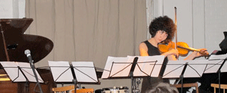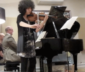 Beethoven, Debussy, Schonberg Violinist Aisha Orazbayeva and pianist Matthew Schellhorn [L] A demanding recital prior to a French tour, at an unannouced location, which turned out to be the delightful living room of a private home, its location only revealed upon booking ! After a Paganini warm-up to show her technical credentials, Aisha moved to the last and, for some of us, deepest of Beethoven's sonatas, well partnered by Schellhorn on a smallish Baldwin piano which sounded good in what had become a pleasing music room, its good acoustics helped by some sound-absorbing panels on the wall. There was seating for perhaps up to c.40, some of it on floor cushions. Schoenberg's strange Fantasia, its violin part composed first, independent of the piano accompaniment (hear it from Menuhin & Gould !), is hard to love as against one of Telemann's. In that and a great Bach Partita Aisha demonstrated her command of non-vibrato period style. All that and a fine account of Debussy's sonata; and to finish a memorable evening there were lavish refreshments brought by audience members to share... The organisers asked to be told of any other homes suitable for Pop-Up Circus Living Room Concerts ? Aisha Orazbayeva's second solo album is promised, and Peter Grahame Woolf Aisha playing Berio at Cafe Oto - Photo R [MusicalPointers] Enjoy Aisha in a "nonclassical contemporary mixcloud compilation" with Sciarrino etc |