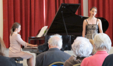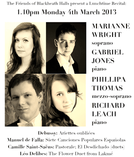 A very pleasant lunchtime concert, well designed for the venue and its audience, with the two young singers suitably dressed for an informal lunchtime occasion. The original texts were supplied, which was most helpful for the Debussy and Delibes items. Marianne Wright in green had a voice on the small side, but her articulation was excellent and her gestures appropriate - she might have needing to husband her voice because of a cold, as had to repeatedly pick up her glass of water from underneath the piano. Phillipa Thomas in red had a stronger presence and put over the Falla popular songs with flair. The two of them enjoyed duetting in Saint-Saens and joined in a tour of force for the melodious Lakmé favourite; timely, as the whole opera was on Sky Arts 2 that week, and turned out to be better than I'd anticipated. The two pianists took turns and page-turned for each other which helped the atmosphere. Peter Grahame Woolf