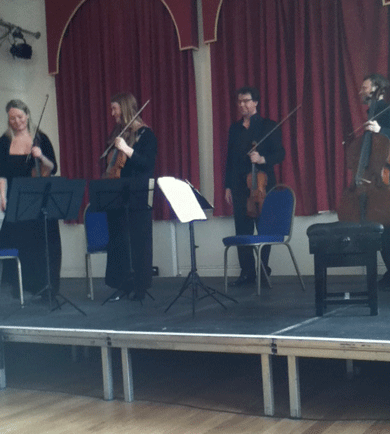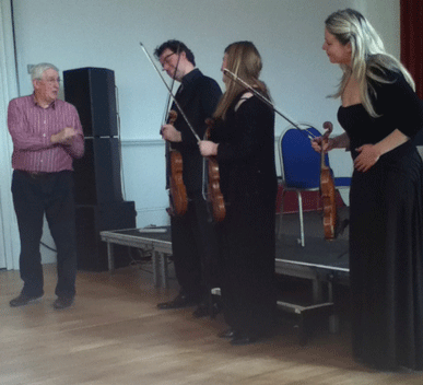 In 2011 Tom Butler's 75th birthday was marked by a specially commissioned celebratory piano quintet at St Olave's in the City, and the following year the Badke Quartet appeared there and included the Britten No. 3 to mark Butler's retirement as curator of the successful series of lunchtime concerts he'd curated there. He handed them over as a This year he brought to Blackheath the renowned Badke Quartet for another extraordinarily moving account of the third and last of Britten's string quartets, its composition completed at Venice and evoking the opera Death in Venice. This performance was especially remarkable given that the violinists Lana Trotovšek and Emma Parker were replaced for this occasion by Charlotte Scott (of the Piattis) and Helena Nicholls - photographed above L with violist Jon Thorne receiving Tom Butler's appreciation; their cohesion was so perfect that you'd never have guessed. Cellist Jonathan Byers, who announced the Britten quartet helpfully, is with them in the other image (photography allowed upstairs !) which gives a glimpse of the newly restored Recital Room's improved look. The Recital Room was packed and afterwards Tom Butler's generosity extended to a magnificent snacks and drinks buffet for everyone. An occasion to remember. Peter GrahameWoolf