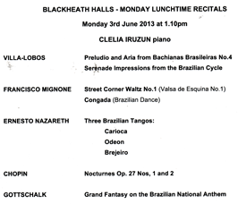 Clélia at Blackheath 3 June 2013 This was, simply, one of the best piano recitals I've heard in many a long year. I had enjoyed Clélia Iruzun in duo and on CD but not previously heard her solo.* She has an easy manner and good rapport with her audience, and we all enjoyed this programme of mainly South American music, plus magical, unforgettable Chopin. It is not long since there were discussions about the Recital Room's refurbishment, and whether carpeting might be needed to dampen over-loud experiences of piano and from opera singers there. Clélia Iruzun scotched those thoughts, producing the best sounds ever from Blackheath's Bösendorfer, with a wide range from pp to fff, demonstrating that her ears are as sensitive as her fingers reliable. Her control of dynamics was such that we would have been happy with even louder climaxes... For her extensive 18th/19th C. repertoires, Clélia Iruzun's DVD of Beethoven, Chopin, Mendelssohn etc, recorded in the Yehudi Menuhin School **, is recommend most strongly [Classical Recording Company CRC-DVD 1909]. [In the school's early days my young son, budding pianist and singer, had been offered a place there by the first director of music, Belgian pianist Marcel Gazelle **, which in the event was not taken up, seemingly wisely in retrospect...). Peter Grahame Woolf *See generous selection of Clélia Iruzun on video !