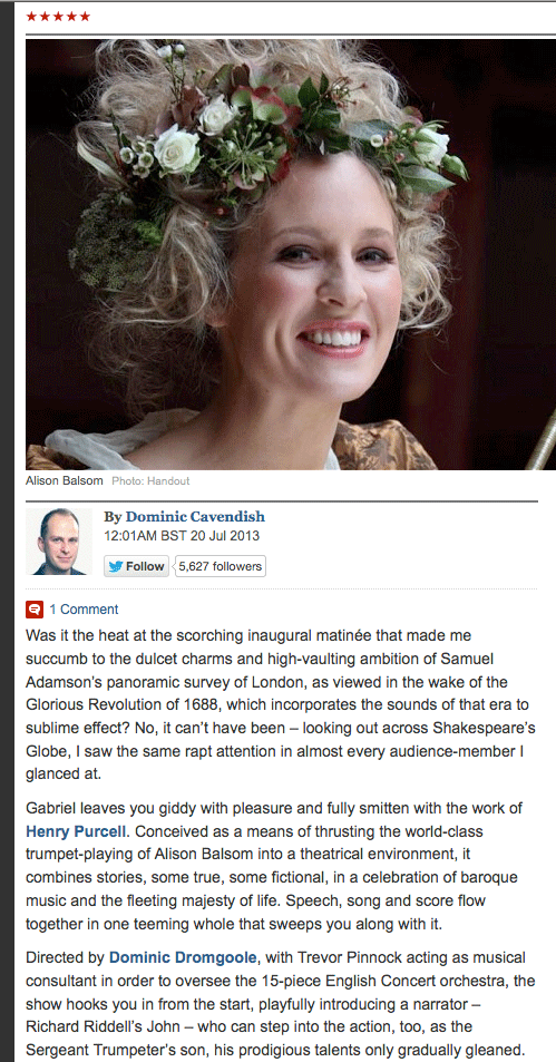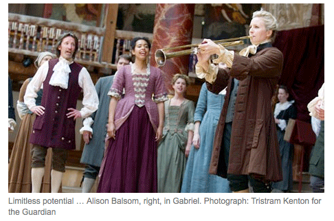 PURCELL etc Gabriel by Samuel Adamson Dominic Dromgoole director Shakespeare's Globe, 20 July 2013 A thrilling genre-breaking afternoon with the best presentation of Purcell's music on stage I've ever seen or heard. Time does not allow immediately as full a review as it deserves. Happily all my feelings are seconded by an early review in The Telegraph, and I can do no better than quote part of it below and urge you to read it in full. Sadly, photographing there was strictly not allowed so I'v borrowed from the Guardian & the Telegraph. Readers: do urge The Globe to produce a DVD as quickly as possible ! Peter Grahame Woolf