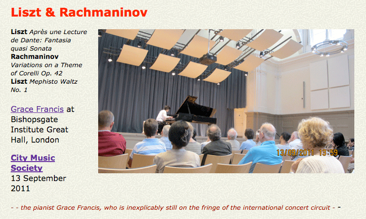 Martin Roscoe at Bishopsgate Institute 14 February 2013 The well known British pianist Martin Roscoe gave a fine recital (Concert No. 433 !) to inaugurate the venerable City Music Society's transfer of their evening series to the splendid refurbished hall opposite Liverpool Street Station as their new home [see review of Grace Francis below]. It came in a difficult time for Roscoe, who found himself in After a Haydn starter (I find these hard to enjoy on modern grand pianos since Tom Beghin's recording on period instruments for the 2009 Haydn bicentenary) he gave a heart warming account of the Schumann Kinderscenen, notable for his marvellous pianissimo in the more tender pieces. Then, major sonatas from the standard repertoire; Beethoven's Waldstein given with panache and fullest drama, followed (after drinks in the interval for everyone) by a deeply moving and involving account of the 'heavenly lengths' of Schubert's Bb sonata, which gained enormously from being heard live instead of on one of the numerous CDs or on radio. It is late Schubert, in two halves. The sizeable audience was held in rapt silence for the dark first two movements, then we were all relieved by the sparkling scherzo and finale, its lightened mood followed in the encore, a little Scherzo in Bb - if you don't remember it, enjoy it from gifted children on YouTube! Peter Grahame Woolf See Martin Roscoe interviewed at the Guildhall SMD