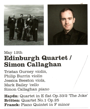 Conway Hall Sunday Concerts 2013 Britten, Brahms, Faure, Schubert, Sellars Schubert Standchen, Gebet and Marches Caracteristiques English Chamber Choir/Guy Protheroe 26 May 2013 It was good to have an opportunity to hear Brahms Liebeslieder Waltzes complete, but this distinguished recording choir was not in good form for this "end of term" concert. The programme note reminds us that the Waltzes were intended for domestic use, and for a quartet of singeers, not full choir. The English Chamber Choir has a distinguished discography, with important reccordings of such a Jonathan Harvey and Xenakis. Peter Grahame Woolf Haydn, Britten & Franck Conway Hall 12 May 2013, 6.30 pm A fine evening, with the Edinburgh Quartet displaying great refinement in one of Haydn's most popular quartets, its joke coming at the very end. Britten's first is probably the least well known of his three (there are also some juvenilia) and it was good to have already heard it twice in this centenary year. The Franck quintet is what we'd really come for, and Simon Callaghan was assured and tireless in its formidable piano part, a plethora of noted and no time to rest. A rewarding piece, but one not to hear too often. Peter Grahame Woolf Hear Callaghan with his frequent colleague Hiro Takenouchi providing a piano duet accompaniment for Guy Protheroe's English Chamber Choir at the special last concert of this series, May 26th. Ravel’s Shéhérazade and songs by Fauré, Poulenc and Rachmaninoff. A marvellous concert for the new year reunion of Conway Hall's Sunday loyalists. Some regulars there might though have been wary of a song recital, as the audience was only of moderate size. Peter Grahame Woolf